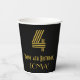 This 1920s-1930s style inspired and vintage look birthday-themed paper cup design features a large art deco inspired style number “4”, in addition to the birthday greeting message “Happy 4th Birthday,” and a personalised name. The background is coloured black. Paper cups like this might be used at a birthday party for somebody who is celebrating their 4th birthday. [~Z0000546]