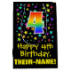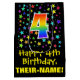 This exciting, vibrant, and colourful birthday themed gift bag design features a large number "4" with a rainbow spectrum gradient style pattern, along with the message "Happy 4th Birthday,", and an editable recipient name. It also has a background pattern featuring star shapes of various sizes and colours. A birthday themed giftbag like this might be used when giving a gift or present in celebration of somebody’s fourth birthday. [~Z0000510]