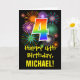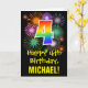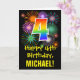 The front of this colourful, exciting, and fun birthday greeting card design features a large number "4" with a rainbow spectrum gradient inspired pattern, along with the message "Happy 4th Birthday,", and a custom recipient name. The front additionally has a colourful background pattern inspired by bursting celebratory fireworks. The inside features a custom birthday greeting message, or could perhaps be cleared and left blank if a message is to be written by hand instead. A personalised birthday card like this might be a fun way to celebrate somebody’s fourth birthday. [~Z0000442]