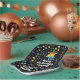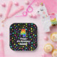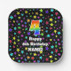 This vibrant and colourful birthday paper plate design features a large number “4” with a rainbow spectrum gradient inspired pattern, along with the message “Happy 4th Birthday,”, and a custom name. The background features a multicolored pattern inspired by a field of stars. Exciting birthday themed paper plates like this might be used at a birthday party for somebody who is celebrating their fourth birthday. [~Z0000582]