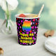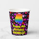 This colourful and happy birthday paper cup design features a large number “4” having a rainbow spectrum gradient inspired pattern. It also features the message “Happy 4th Birthday,”, and an editable name. The background features a pattern of heart shapes with colours like purple, pink, and red. Upbeat, fun paper cups like this might be fun to have at a birthday party being held to celebrate somebody’s fourth birthday. [~Z0000548]