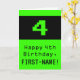 The front of this geeky and fun birthday-themed greeting card design features a large green retro computer gaming style number "4". It also features the birthday greeting message "Happy 4th Birthday,", and a name that can be customised. The inside features an editable birthday greeting message, or could perhaps be cleared and left blank if a message is to be written by hand instead. A nerdy personalised birthday card like this might be a fun way to acknowledge somebody’s fourth birthday. [~Z0000430]