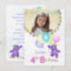 4th birthday party custom name and photo invitation featuring a cuddly and cute purple teddy bear princess dressed up in a lovely yellow jewelled crown and pink, blue and green flower accessories holding a bunch of balloons with the word PARTY on them. Personalising with child's photo and name makes it extra special. It's a fun royal theme for a special princess. Original design by Anura Design Studio.