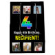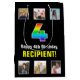 This joyful and cheerful birthday gift bag design features a large number “4“ having a vibrant multicolored rainbow spectrum inspired gradient pattern, plus the message “Happy 4th Birthday,“ and a personalised recipient name. The photos above and below the message can be personalised, perhaps with photos of the recipient, the recipient’s family and friends, and/or the sender(s) of the gift. A fun gift bag like this might be used when wrapping presents being given to somebody in celebration of their fourth birthday. (Photography © Storytree Studios, Stanford, CA.) [~Z0000669]
