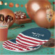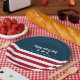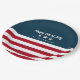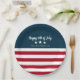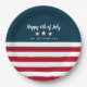 Decorate your table with these 4th of July American Flag Personalised Party Paper Plates. This modern red, white and blue design has stylish customisable text "Happy 4th of July" in white script lettering on upper dark blue stripe with three stars. Each plate has red and white stripes on the lower area to give the flag style. Personalised with family name or your customised text in simple print lettering.