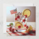 Party cocktail with cherries, a small American flag, and lemon slices on red and white checked cloth for an Independence Day barbecue party invite.