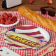 Patriotic invitation with hot dog on flag plate for 4th of July Party.