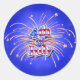 Golden fireworks with stars bursting in celebration behind US flag filled 4th of July lettering for an Independence Day round sticker. You may also enjoy cards and gifts with this bright 4th of July design available in my store. Original design by Anura Design Studio.