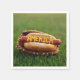 A hot dog in a bun with the word "AMERICA" written in mustard rests in a baseball glove