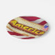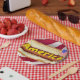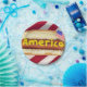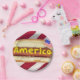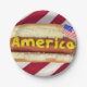 hot dog on American flag plate with mustard and tiny flag for 4th of July party