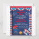 This simple, patriotic 4th of July Independence Day Party invitation. The invitation design is for a 4th of July Backyard BBQ event. The background features patriotic red, white, and blue colours with star and stripe patterns. Decorative elements include festive fireworks graphics and themed banners at the top. The invitation text is centred and highlights the event details in bold, red and white fonts.