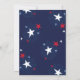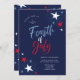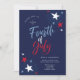 4th of July Red White Blue Fireworks Party Invitation features red, white and blue stars, along with firework details and modern calligraphy.