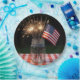 Sparklers in a glass jar illuminate the scene alongside a small American flag, set against a red and white chequered tablecloth
