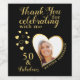 Create unique black and gold Thank You wine bottle labels for the 50th birthday party with an elegant design that features a photo in a heart shape, the name, and the fiftieth milestone. Use the template to type your first and last name and add a photo. The first and last names are changed in separate fields to place them elegantly along the heart. You can also change the milestone to 30th, 40th, 60th, 70th, 80th, etc.