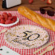 This 50 and Fabulous birthday party plate has a girly pink background with gold confetti and streamers behind bold black type.Simple and elegant for the birthday girl with style.