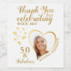 Create unique white and gold Thank You wine bottle labels for the 50th birthday party with an elegant design that features a photo in a heart shape, the name, and the fiftieth milestone. Use the template to type your first and last name and add a photo. The first and last names are changed in separate fields to place them elegantly along the heart. You can also change the milestone to 30th, 40th, 60th, 70th, 80th, etc.