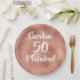 Paper party plates  that celebrate milestone birthdays with a flair.  "50 (name/age/year can be customised) and fabulous"  in modern brush stroke white text on copper and hearts background.