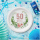 Elegant design for a 50th birthday party with a blush pink "50" and scripted "fabulous" embellished by a feminine floral wreath on a white background contrasted by a floral outline. Customise age, text and background colour.