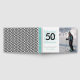 Customize with your own photo and personalize the name, birthday party date, and text. The teal and black text colors can be changed by clicking the "Customize" button. A geometric black and white meander pattern with diamonds and zigzags adorns the back cover of the book. Other colors and patterns are available.