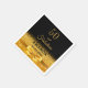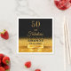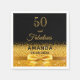 Elegant, classic, glamourous and feminine style napkin for a 50th birthday party. A gold coloured ribbon and bow with faux golden glitter and sparkle, a bit of bling and luxury. Black background. With the text: 50 and Fabulous. Templates for name and a date.