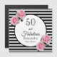 A magnet for a 50th birthday party. Classic slim black and white horizontal stripes as background. With girly and feminine pink roses as decoration.