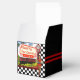 Square black classic-style favour box with an image, on the front and back, of a 50s retro diner sign that reads, “Thank you for coming,” a red diner clock, and a vintage 50s female server on a black and white chequerboard. Two red stripes encircle the box. See matching "50s Retro Diner Blank Sign" favour box. See the entire Nifty 50s Favour Box collection in the PARTY FAVORS section.