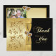 This elegant black and gold floral thank you card with photo has a PRINTED gold metallic look ribbon and bow with a pair of PRINTED glitter and diamond jewelled joined hearts on it that matches the 50th wedding anniversary invitation shown below. All the text is customisable, and so are the paper choices. ALSO, if you change fonts or font sizes, your text may not fit properly anymore. Zazzle will not edit anything for typos, mis-alignment, or anything else, and I will not see your invitation. Everything will print as it appears on your monitor. If you need help with the invitation, please contact me BEFORE you order it. This invitation is designed to fit the 5x7 size card. If you change to another size, the design will no longer fit properly, so if you want a different size, please contact me so I can re-design it for you. If you require any other matching items in this design, please email your request to niteowlstudio@gmail.com.