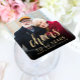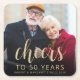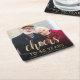 This personalized 50th wedding anniversary paper coaster features the couple's photo, along with their names and the date in gold-colored sans serif font and the word "Cheers" in elegant gold-colored calligraphy script. A dark screen helps make the text pop. A great way to help a special couple celebrate their golden wedding anniversary!