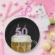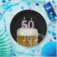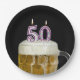 Lit birthday candles in mug of beer on black for 50th birthday.