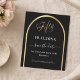 A Save the Date card for a 50th birthday party. A black background, decorated with a faux gold arch. Personalise and add a date and your name. The text: Fifty and Save the Date is written with a large trendy hand lettered style script.