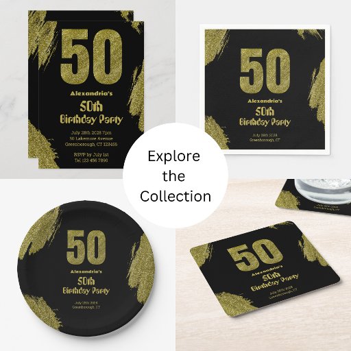 This is a modern and stylish 50th birthday party design. This stylish design is in classic black and gold with gold glitter effect brushstrokes. It has the text, "50" and space for you to add your name, party date and location, This stylish design is perfect for a chic and unforgettable 50th birthday party celebration. To personalise, simply add your name, date, party details in the personalise this text box. To change the colour or font, check out the design editing tool. You can even change the gold glitter effect if you want to. If you need help with personalisation, or for a custom design contact me via zazzle chat or email: ursuladawnmoon@gmail.com