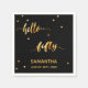 Elegant and modern for a 50th birthday party. Black backdrop and faux gold text written with a trendy hand-lettered style script: hello fifty. With golden dots as decor. Templates for a name and date.