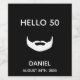 A modern wine bottle label for a 50th birthday party for guys in black and white. With the text: Hello 50. With an image of a beard. Templates for a name and date. Black background colour.