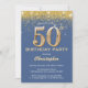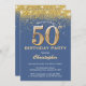 50th Birthday Blue and Gold Glitter Confetti Invitation
