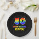 This cheerful, fun, and colourful birthday paper plate design features a large number "50" and the message "HAPPY BIRTHDAY,", both coloured with a rainbow spectrum gradient inspired pattern, along with a bold yellow customisable name. It has a black coloured background. Fun, editable paper plates like this might be used at a celebration being held to honour somebody’s fiftieth birthday. [~Z0000488]