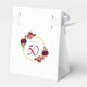 Front and back: A chic white background with a faux gold geometric frame. Decorated with dark purple and burgundy flowers, roses and boho style feathers. The name is written with pink hand lettered style script. The date is written with black numers and age 50 in burgundy.
