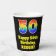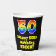 This colourful and fun birthday paper cup design features a large number “50” having a rainbow spectrum gradient inspired pattern. It also features the message “Happy 50th Birthday,”, and a custom name. The background is coloured black. Vibrant, colourful paper cups like this might be fun to have at a birthday celebration being held in celebration of somebody’s fiftieth birthday. [~Z0000537]