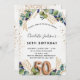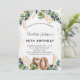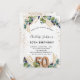 For a 50th birthday party. A white background decorated with eucalyptus greenery and golden leaves. Golden faux glitter, sparkles. Personalise and add your names and wedding details. Black and golden coloured letters. Number 50 is written with balloon style font.