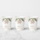 For an elegant 50th birthday party. A white background. On the front and the back: Personalise and add a name and a date. Decorated with eucalyptus greenery and faux glitter dust. Nr 50 is written with a balloon style font.