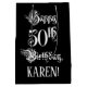 This elaborate and fancy birthday giftbag design features the message “Happy 50th Birthday,” in lavish script style text, on a black coloured background. It also has a customisable recipient name. A gift bag like this might be used when wrapping gifts being given to somebody in celebration of their 50th birthday. [~Z0000557]