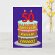 The front of this upbeat and joyful birthday greeting card design features a depiction of a three-tier birthday cake having number-shaped candles on top showing the age “50“, along with the message “HAPPY 50TH BIRTHDAY,”, and a custom recipient name. The inside has a custom birthday greeting message, or could perhaps be cleared and left blank if a message is to be written by hand instead. A cheerful, personalised birthday greeting card like this might be a fun way to deliver some birthday wishes to somebody who is celebrating their fiftieth birthday. [~Z0000620]