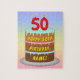 this upbeat and fun birthday jigsaw puzzle design features a cartoon-style depiction of a three-tier birthday cake having numeral-shaped candles on top showing the number “50“, along with the message “HAPPY 50TH BIRTHDAY,”, and a personalised recipient name. The background features a multicolored pastel rainbow spectrum inspired gradient pattern. A colourful, personalised birthday puzzle like this might be used to celebrate somebody’s fiftieth birthday. [~Z0000621]