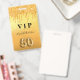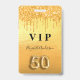 A modern, stylish and glamourous badge for a 50th birthday party. A fauc gold looking background with faux glitter drip, paint dripping look. The name is written with a modern hand lettered style script. With the text: VIP Number 50 is written with a balloon style font, script.