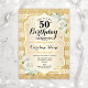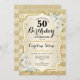 50th Birthday Invitation. Elegant floral design in gold and white. Features faux glitter gold stripes, white roses stylish script font and confetti. Perfect for a glam birthday party.