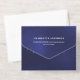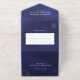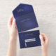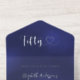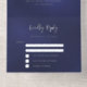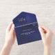 A navy blue background. The blue colour is uneven. Personalise and add name, party details, RSVP date, return address and name. Fifty with a heart. Silver foil inside.