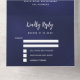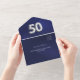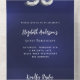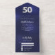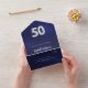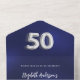 A navy blue background. The blue colour is uneven. Personalise and add name, party details, RSVP date, return address and name. Number 50 is written with a balloon style font in faux silver.