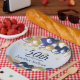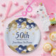 A stylish 50th birthday Party plate . Design features navy blue and gold balloons, Gold glittery starts and navy blue text all on a pale blue gradient background. A lovely party table addition for a 50th birthday party celebration. Easy to customize with your own details.