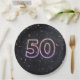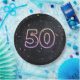 Glowing neon sign with confetti on black background for 50th birthday party.