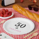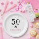 Celebrating a fabulous 50th birthday garden party plate design in pink with black text. To view more products click the store link.