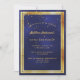 A trendy, modern 50th birthday party invitation card for men, guys, male. A dark blue, navy blue background. The blue colour is uneven. With a faux gold frame and golden confetti sprinkle, golden coloured letters. Templates for your party information.